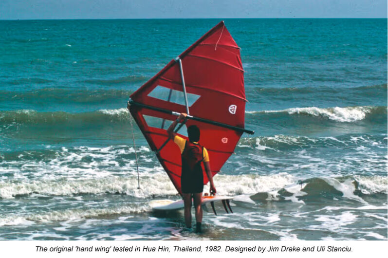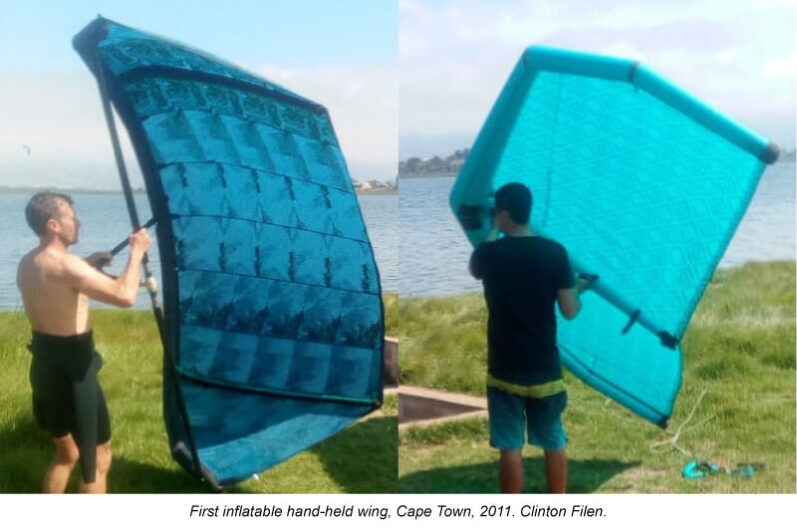Starboard’s connection to wings runs deep. The original wing was patented by Jim Drake in 1982 – the same innovator who co-created windsurfing. From 1999, Jim worked closely with Starboard and in 2011, Starboard’s Clinton Filen pioneered the first inflatable wing after elaborate discussions with Jim (Figure 1 below). And in 2020, the world’s first double-surfaced wing was built at the Starboard workshop and tested locally at Wongamat Beach, Thailand – paving the way for today’s modern wing designs.